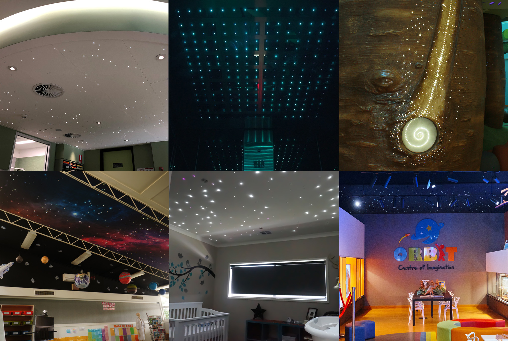 The starlight system uses an illuminator to project light through a network of fibre optic cables attached to acoustic panels. Each panel emits an array of starry lights controlled by a wireless remote for colour changing and star-twinkling effects.