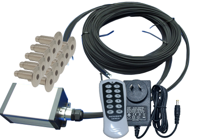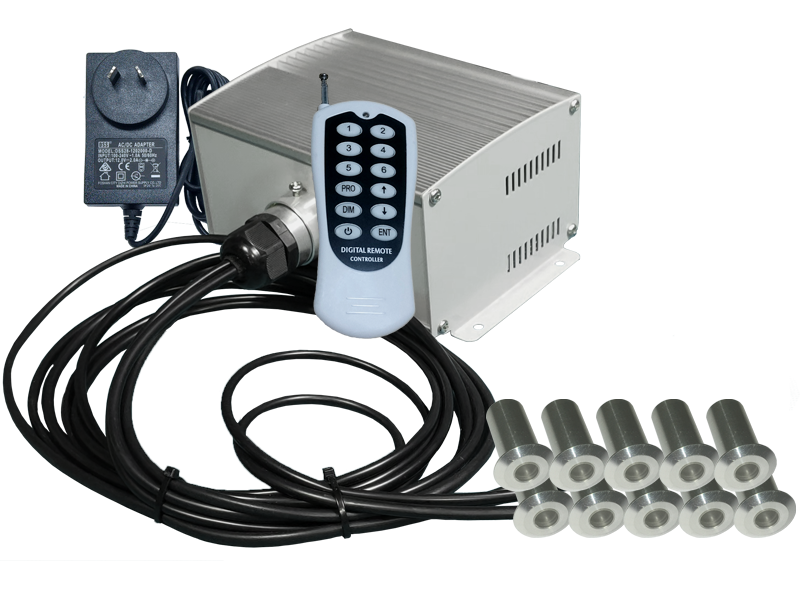 The fiber optic downlight kit uses a bundle of 5mm (outside diameter) fiber cables connected to the illuminator. Connect up to 25 light fittings by choosing the different bundle length options to suit your project. Each bundle has 5 light fittings and 5 fiber cables at various lengths.