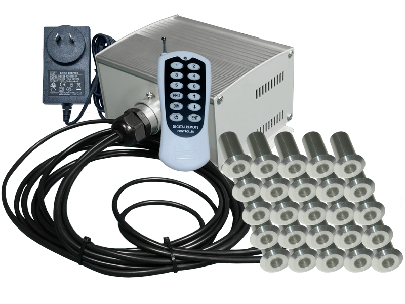 The fiber optic downlight kit uses a bundle of 5mm (outside diameter) fiber cables connected to the illuminator. Connect up to 25 light fittings by choosing the different bundle length options to suit your project. Each bundle has 5 light fittings and 5 fiber cables at various lengths.