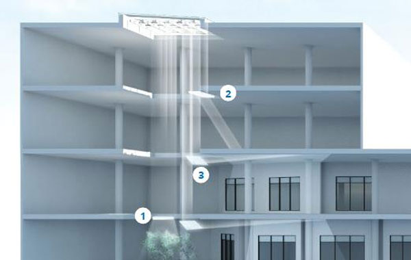 The SunBeamer™ is a revolutionary daylighting product that delivers full-spectrum natural sunlight to previously inaccessible areas in buildings. The unit concentrates and provides sunlight in a collimated beam up to 200m. This collimated beam is then redirected into areas where daylight is desired.